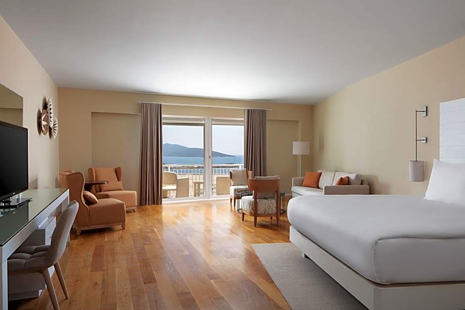 Large suite with separate living and dining area, a kitchenette, and a private entrance. It features an iPod docking station. Panoramic views of the Aegean Sea are offered.